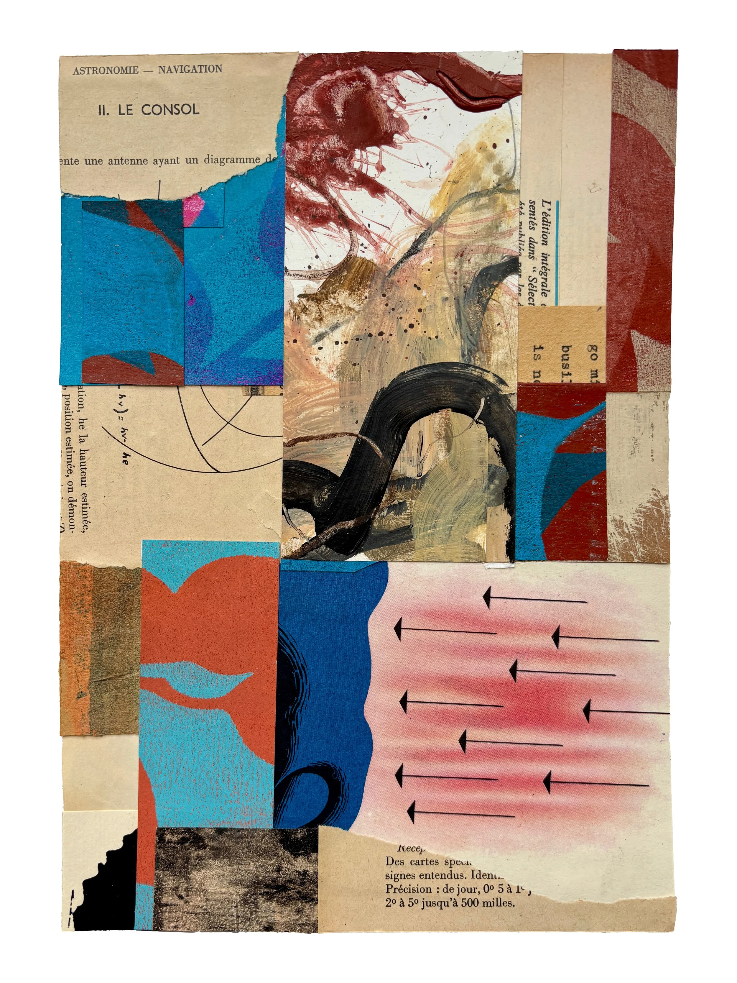 I covered substrates with layers of cream-colored vintage papers—signifying the past—then built up juxtapositions of drawn lines, monoprints, and ephemera, all in search of an answer: How did we get to this place and time where, in our desire to make progress, we destroy that which nurtures us?